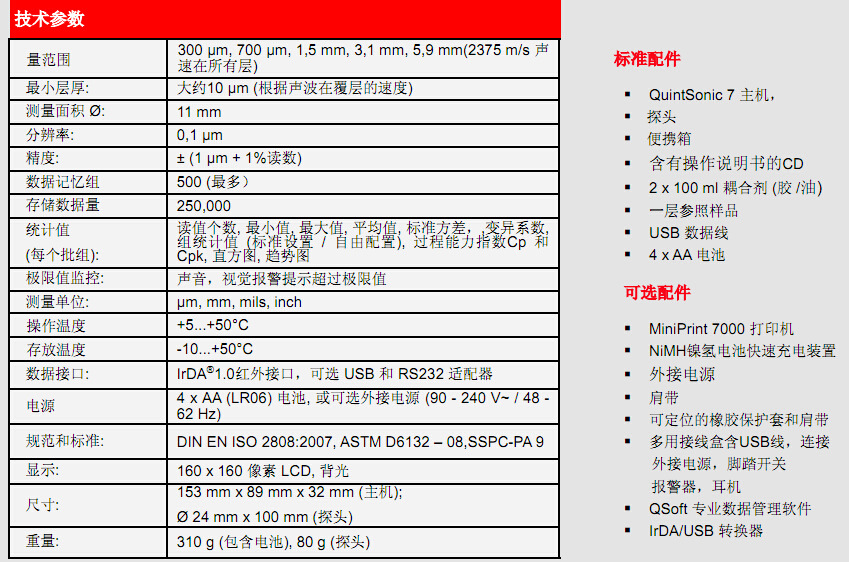 ◆技术参数包括量程,zui小测量厚度,测量面积,分辨率,精度,可存储的数据记忆组数,可显示的统计值(有读值个数,zui小值,zui大值,平均值,标准方差,变异系数,组统计值,过程能力指数,直方图趋势图等),极限值监控,测量单位,操作温度,存放温度,数据接口,电源,规范和标准,显示,尺寸和重量。